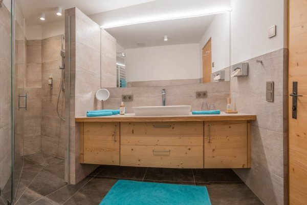 Im Bad mit Fußbodenheizung befinden sich Dusche, Toilette, Fön, Schminkspiegel und Handtuchheizung.